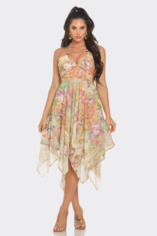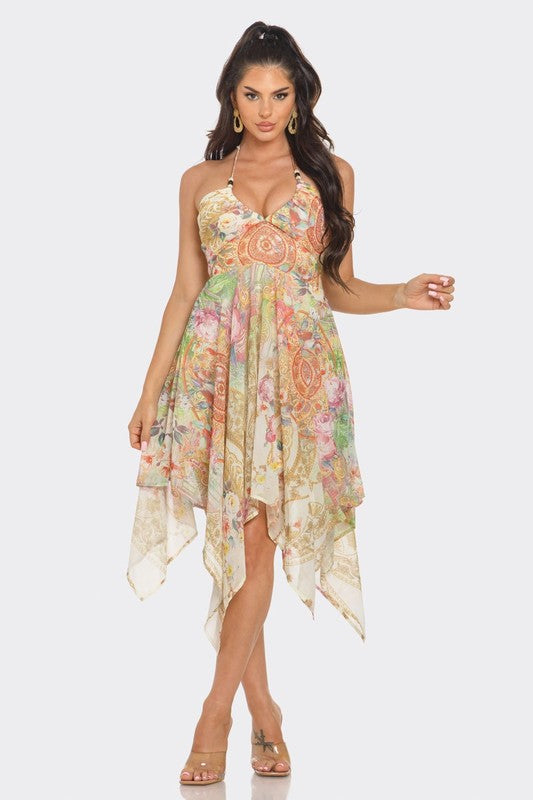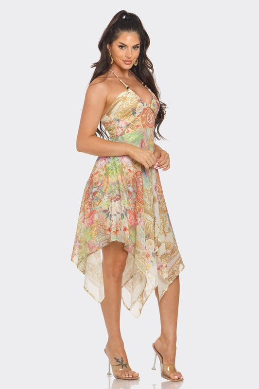 This handkerchief dress showcases a stunning multi-floral pattern and includes a drawstring neckline with a tie at the back. A side zipper ensures effortless dressing and a comfortable fit. Embrace a fairy-like charm with this distinctive and fashionable dress. Consider sizing down for a snugger fit!
